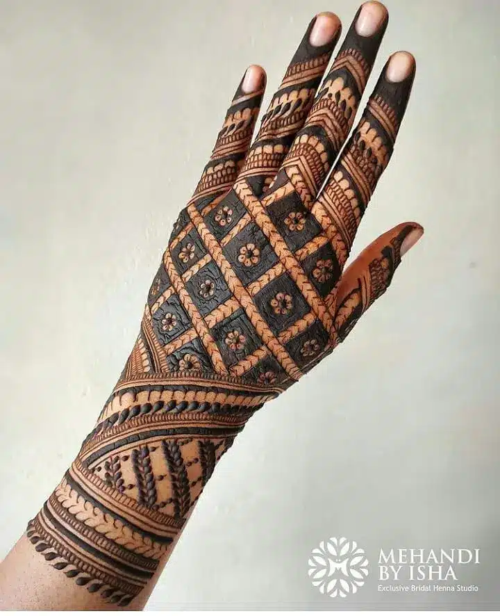 Filled grids mehndi designs are known for their elegance and simplicity and are perfect for those who prefer a subtle and understated look. This type of mehndi design is easy to create and can be done by oneself or by a professional mehndi artist. Filled grids mehndi designs are versatile and can be worn for a variety of occasions, from casual events to more formal ones.