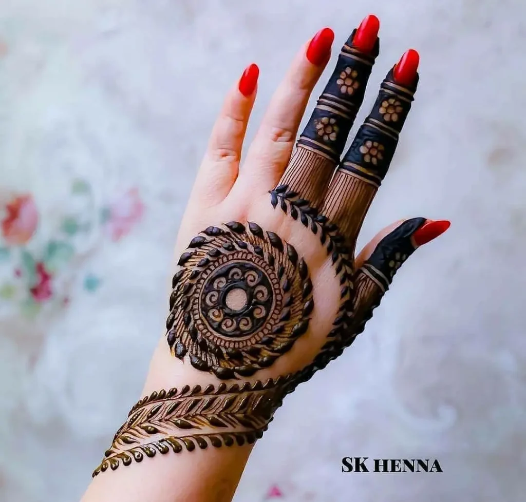 A simple mehndi design for the back of the hands is a minimalist and understated mehndi design that is perfect for those who prefer a more subtle and elegant look. This type of mehndi design typically includes small and delicate motifs such as flowers, leaves, and dots, and is often focused on the fingers and the space between the fingers. The design can be created using only one color of henna paste or can include multiple colors for a more colorful and vibrant look.
