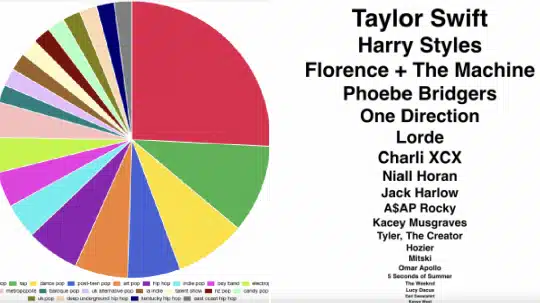 If you hover over a segment of the pie (or tap the screen on your phone), you can discover the genre and which artists fall into it.
