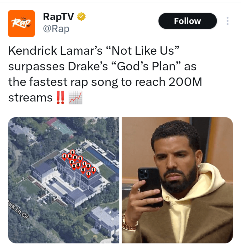 Kendrick Lamar has once again outshined Drake. His diss track “Not Like Us” has surpassed Drake’s “God’s Plan” as the fastest rap song to reach 200 million streams on Spotify, achieving this milestone in just 19 days.