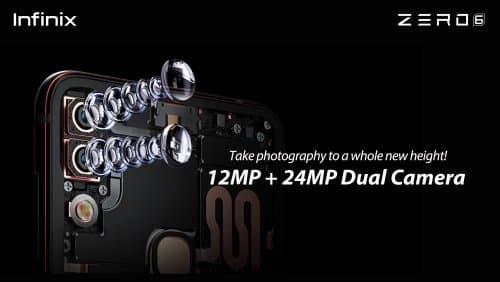 sifa kuu ya Infinix ZERO 6 ni kamera, Infinix ZERO 6 imewekwa nguvu nyingi upande wa kamera nyuma ikiwa na MP 12+MP 24 zenye kupiga picha/picha jongefu na mng’ao wa hali ya juu sana, na kamera ya mbele ni MP 20.