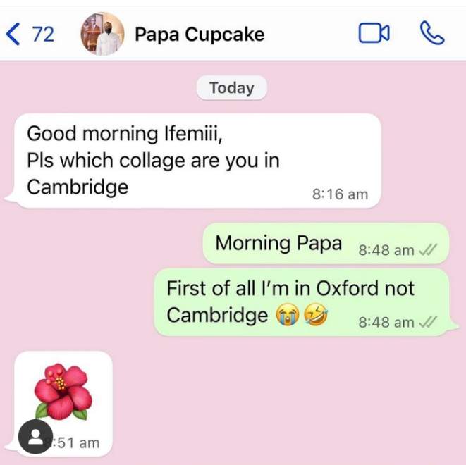 “Good morning Ifemiii, pls which collage are u in Cambridge”.