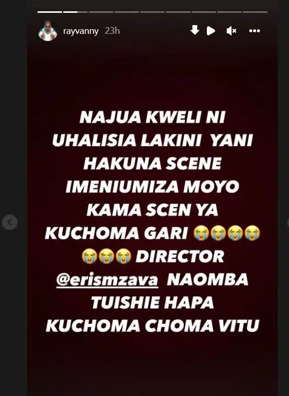 “Najua kweli ni uhalisia lakini yani hakuna scene imeniumiza moyo kama scene ya kuchoma gari. Director Eris Mzava naomba tuishie hapa kuchoma choma vitu.