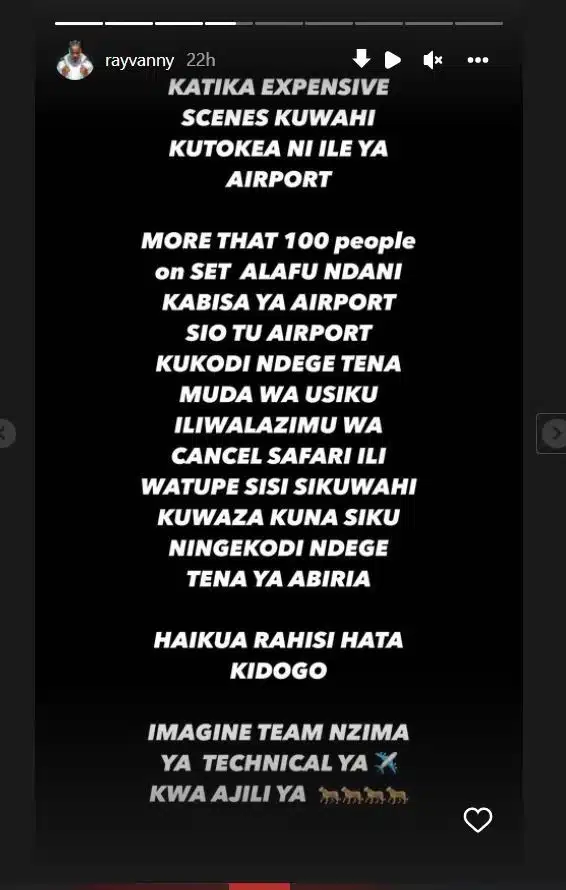 “Kataika expensive scenes kuwahi kutokea ni ile ya Airport. More than 100 people on set alafu ndani kabisaa ya airport, sio tu Airport. Kukodi ndege tena muda wa usiku iliwalazimu wa cancel sagfari watupe sisi. Ikuwahi kuwaza kuna siku ningekodi ndege tena ya abiria. Haikua rahisi hata Kidigo.