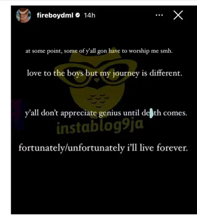 “At some point, some of y’all gon have to worship me smh. Love to the boys but my journey is differentโฆ Y’all don’t appreciate genius until death comes. Fortunately/unfortunately I will live forever”
