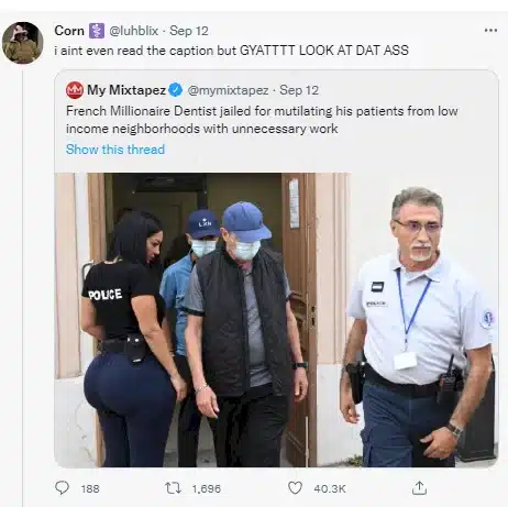 One reader referenced the article saying that their family had suffered at the hands of their own dentist, but that person was quickly shot down by a Twitter user who replied: “are you talking about the ass…. if not we don’t care right now give us a few minutes.”