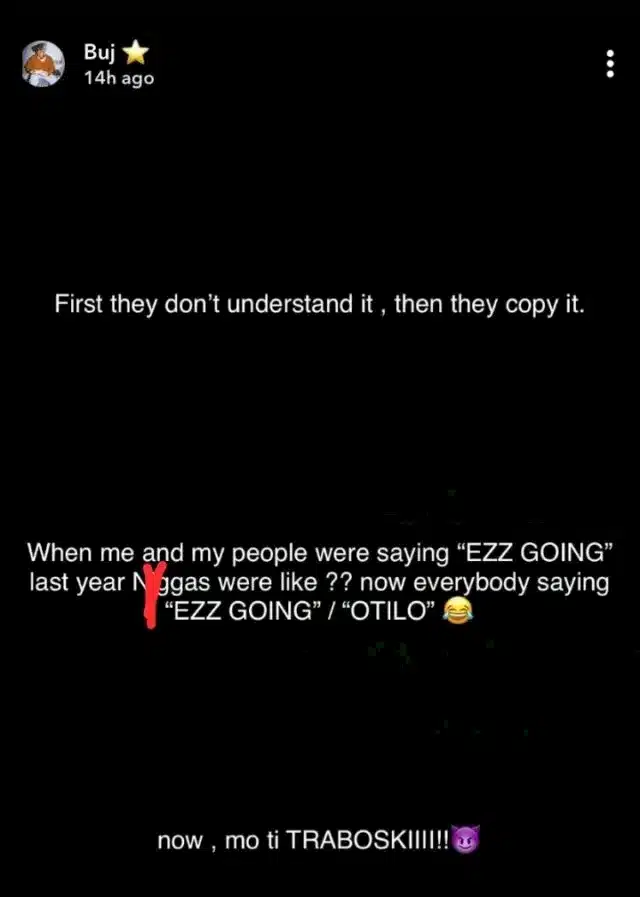 When me and my people were saying “EZZ GOING” last year N as were like ?? now everybody saying EZZ GOING” / “OTILO’ now , mo ti TRABOSKIIII!! “