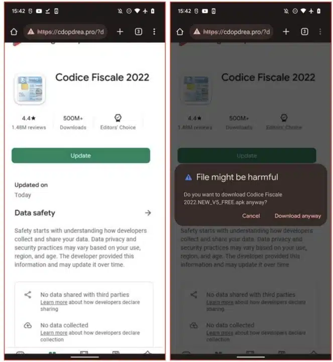 If opened on a phone using a SIM registered in Italy, the app would open a fake Play Store page with a bogus listing for “Codice Fiscale.” This fake listing also revealed that an update was available for the app, something that all users would probably tap on. And while some browsers might warn the user about the update, the owner of the phone could feel comforted by the fact that the app was installed from the Google Play Store and go ahead with the update.