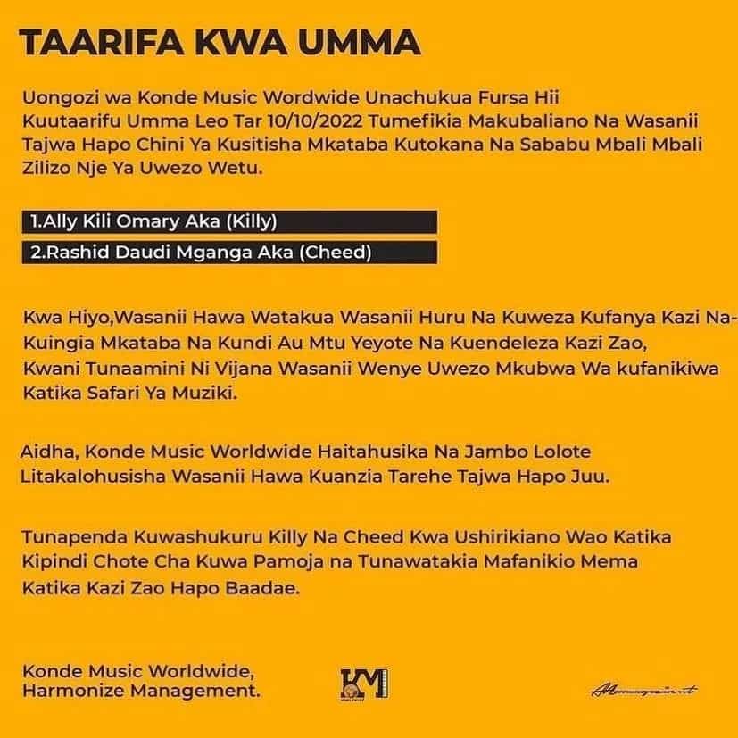 The management of Konde Music Worldwide (Konde Gang) has officially announced the termination of the contract with musicians Cheed and Killy due to various reasons beyond their control. It has been explained.