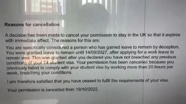 A decision has been made to cancel your permission to stay in the UK so that it expires with immediate effect. The reasons for this are: