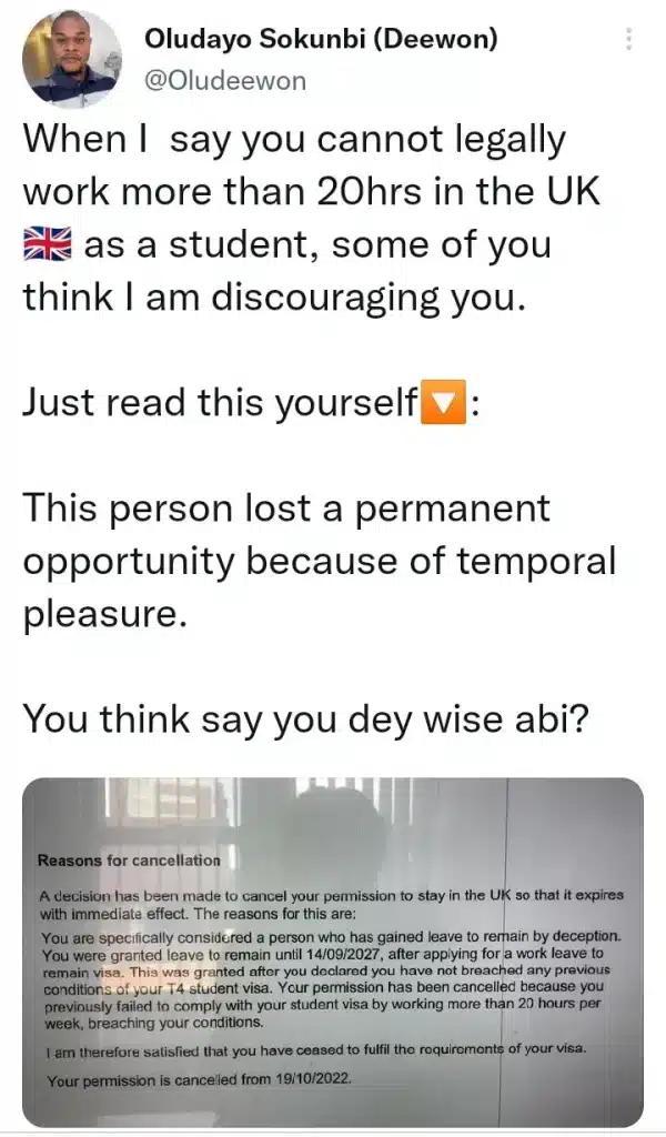 The story was shared by a Twitter user identified as @Oludeewon who alleged that foreign students are not allowed legally to work more than 20 hours in UK.