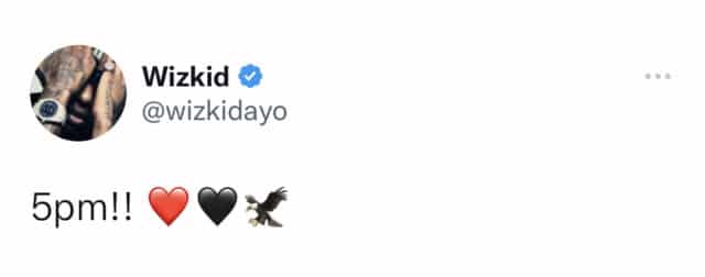 The private star whose known for keeping to himself and staying mum even through controversy, Wizkid has gotten fans in a frenzy with anticipation following his very brief tweet where he simply said; “5pm!! ❤️??”
