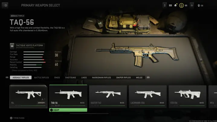 Assault Rifles were key in Warzone and will likely be as important in Warzone 2.0. With that in mind, we highly recommend having the TAQ-56 and all of its attachments ready to go, as this weapon is highly accurate, and hits hard without sacrificing its control. The TAQ-56 has competitive aim-down-sights (ADS) times, a fast time to kill (TTK), and has low recoil, making it easy for all players to use.