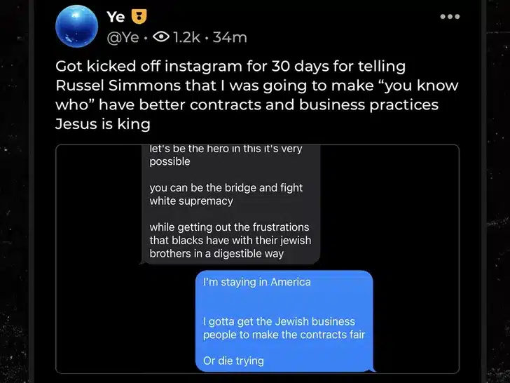 Kanye’s been suspended from Instagram for 30 days after posting a text message exchange between himself and Russell Simmons where he once again made disparaging remarks against Jewish people.