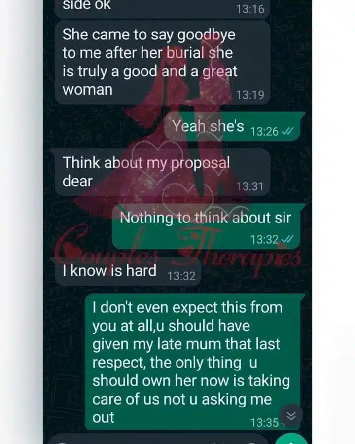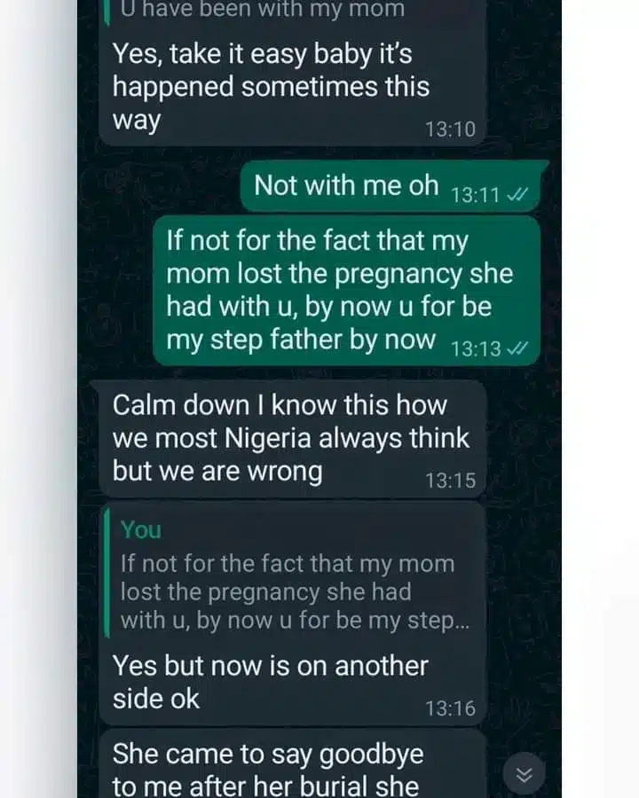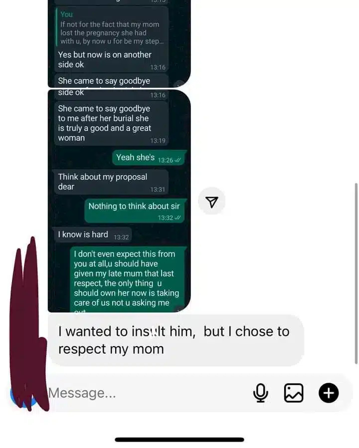 A lady has shared a chat she had with her stepfather who wants to begin an amorous relationship with her days after her mother’s burial.