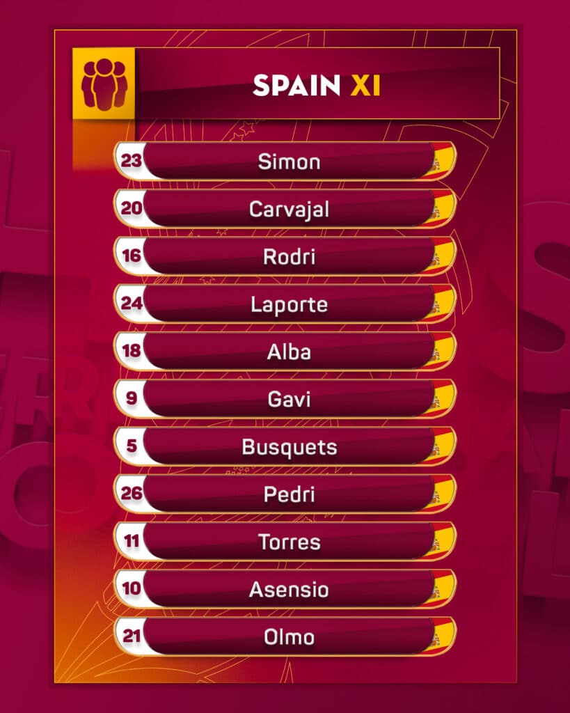 Spain XI: Unai Simon, Dani Carvajal, Rodri, Aymeric Laporte, Jordi Alba, Gavi, Sergio Busquets, Pedri, Ferran Torres, Marco Asensio, Dani Olmo