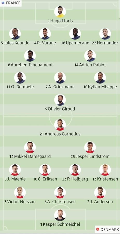 - France XI: Lloris, Koundé, Varane, Upamecano, Hernandez, Rabiot, Tchouaméni, Griezmann, Dembélé, Giroud, Mbappé.