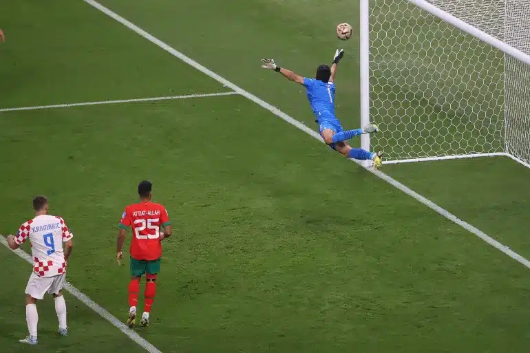 The Morocco keeper kicks the ball across his own goal line and almost into the net. However, it only results in a Croatia corner.