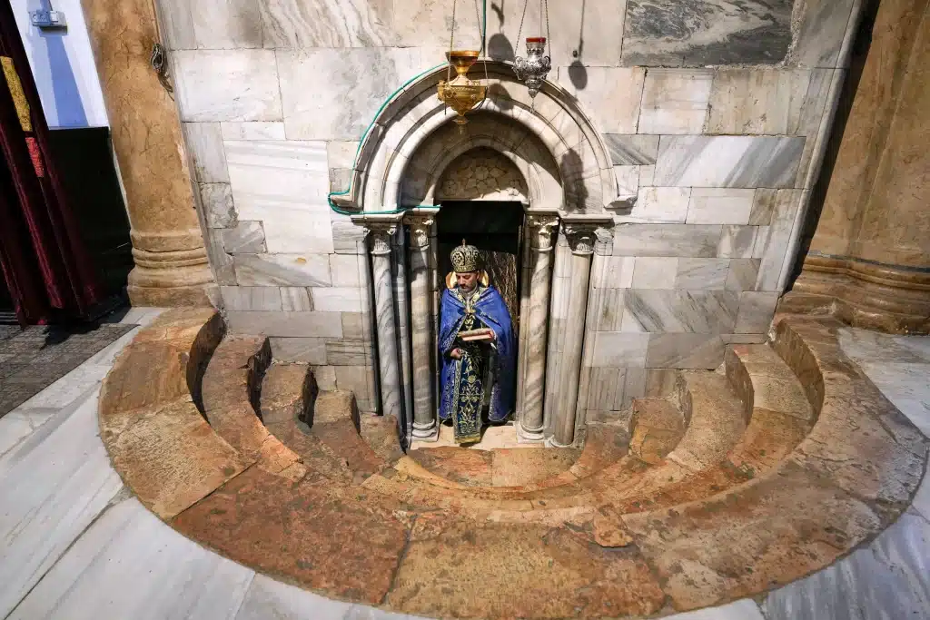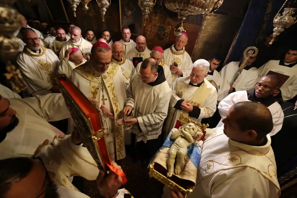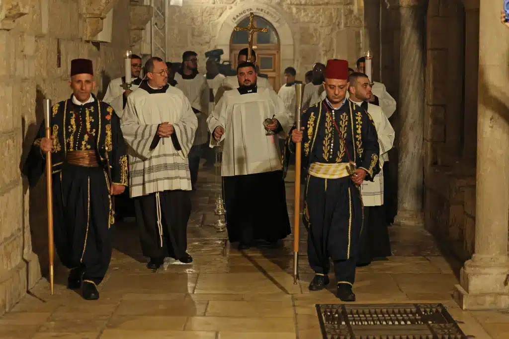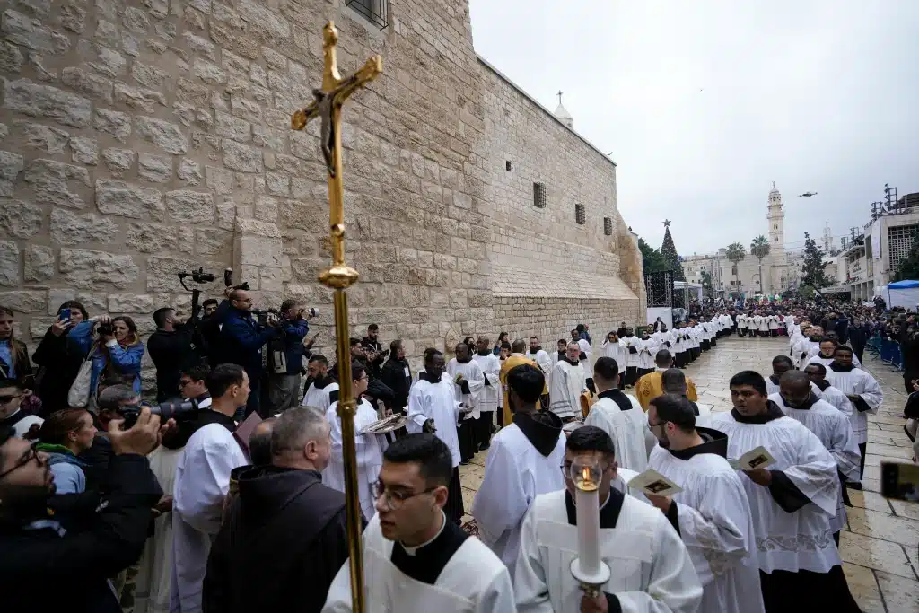 Clergymen and Latin Patriarch Pierbattista Pizzaballa enter the Church of the Nativity.