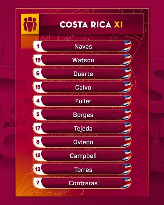 Costa Rica XI: Navas, Vargas, Fuller (Bennette, 74′), Duarte, Oviedo (Wilson, 90+’), Waston, Borges, Tejeda (Contreras, 90+’), Aguilera (Salas, 46′), Venegas (Matarrita, 74′), Campbell.
