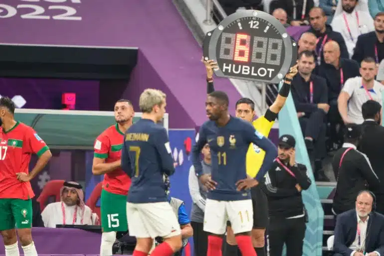 For France, Dembele is off, and Randal Kolo Muani is on.
