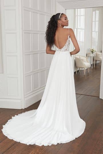 Lace and chiffon A-line gown with a deep V-neckline and lace appliques.