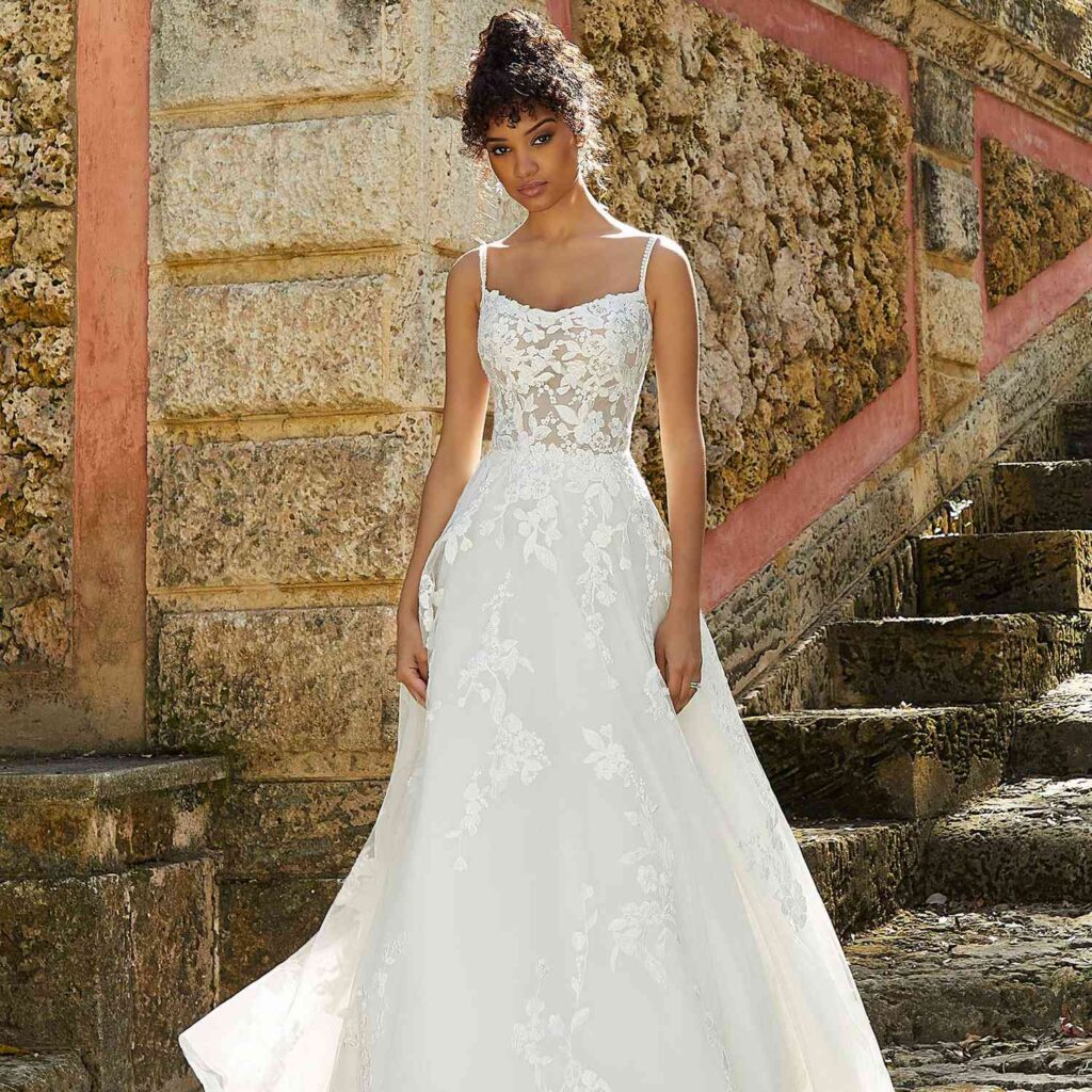 Lace and tulle A-line gown with a sweetheart neckline and a lace-up back.