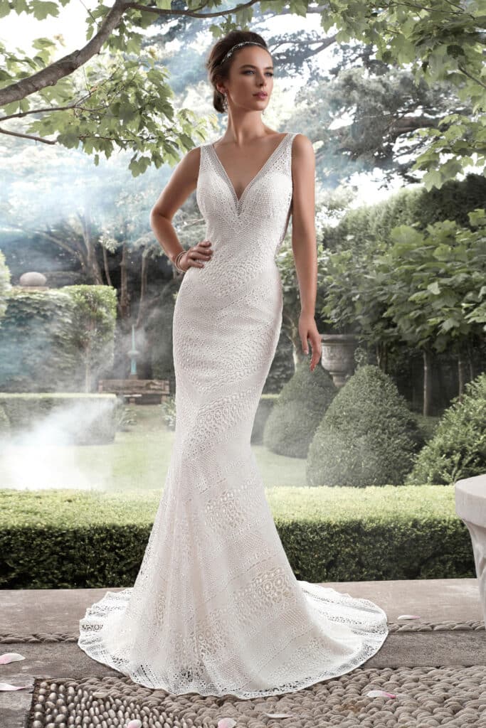 Lace and silk sheath gown with a deep V-neckline and spaghetti straps.