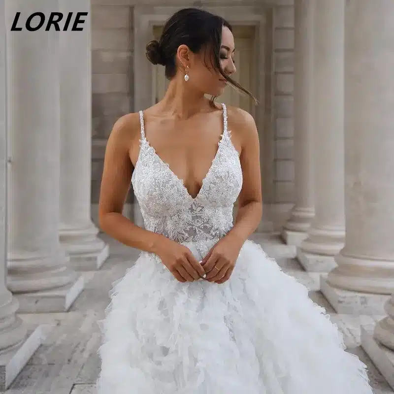 Lace and tulle ball gown with a tiered skirt and lace appliques.