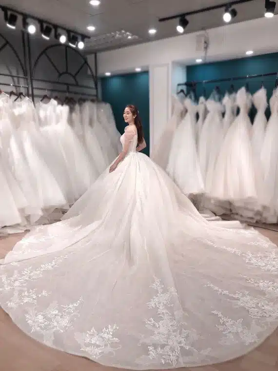 Lace and tulle ball gown with a high neckline and lace appliques.