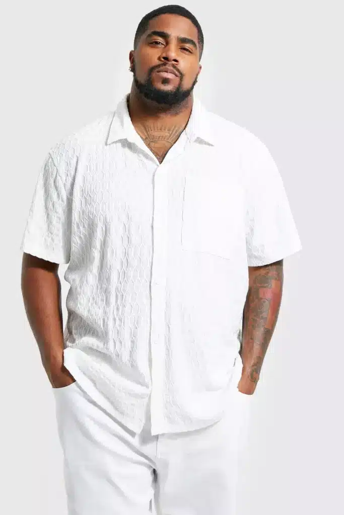 Textured dress shirt: A textured dress shirt, such as one with a subtle pattern or a slight sheen, can add visual interest to your outfit. Just be sure to keep the rest of your look simple to avoid overwhelming the eye.
