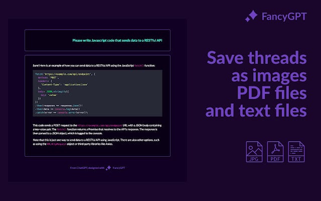 FancyGPT lets you beautify your ChatGPT threads, and store them for future reference or sharing with others with images, searchable PDFs, and text files.