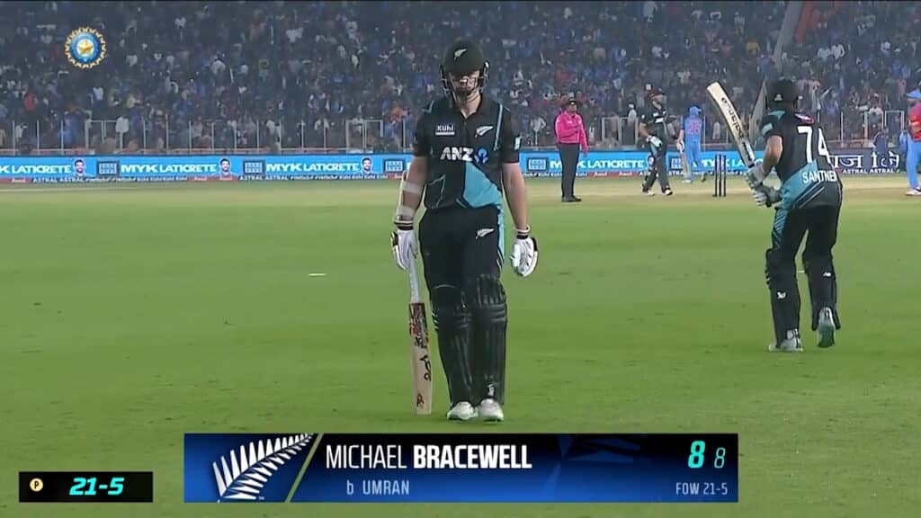 The first six overs of New Zealand’s innings are over. He has scored 30 runs for five wickets in the powerplay. Darrell Mitchell 13 and captain Mitchell Santner is unbeaten after scoring one run. Umran Malik gave India the fifth success. He clean bowled Michael Bracewell on the third ball of the fifth over. Bracewell scored eight runs off eight balls.