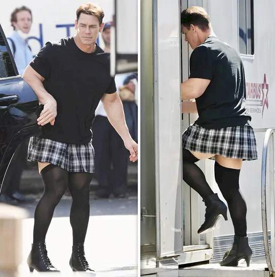 John Cena rocks a mini skirt and high heels: John Cena was seen wearing high heels, a short skirt, and tights on the set of his new movie.