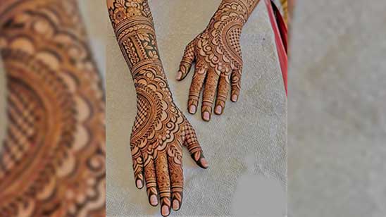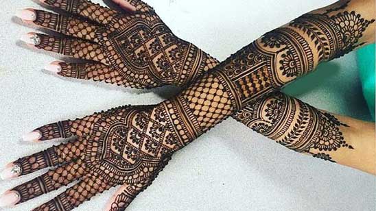 An intricate glove mehndi design for full arms is a type of mehndi design that covers the entire length of the arm, up to the wrist. The design is created to look like a glove, with intricate patterns and motifs that resemble lace or fabric. This type of mehndi design can take several hours to complete and is typically applied by a professional mehndi artist. The design can include a variety of traditional and modern motifs, such as flowers, leaves, paisleys, and geometric shapes.