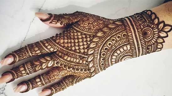 Filled grids mehndi design for the back of hands is a type of mehndi design that features intricate grids that are filled with small and delicate motifs. This type of design is typically created by drawing a series of intersecting lines on the back of the hand to create a grid pattern, which is then filled with small dots, flowers, leaves, or other delicate motifs. The design can also include traditional motifs such as paisleys, geometric shapes, or peacock feathers.