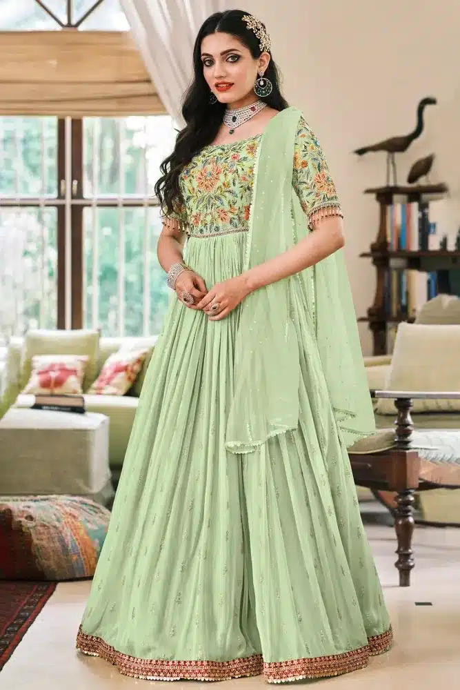 The dress usually has a high neckline and long sleeves, and it is typically made of lightweight fabrics such as cotton, silk, chiffon, georgette, or net. The Anarkali dress is known for its intricate embroidery, embellishments, and designs, which make it a popular choice for formal events such as weddings, parties, and festivals.