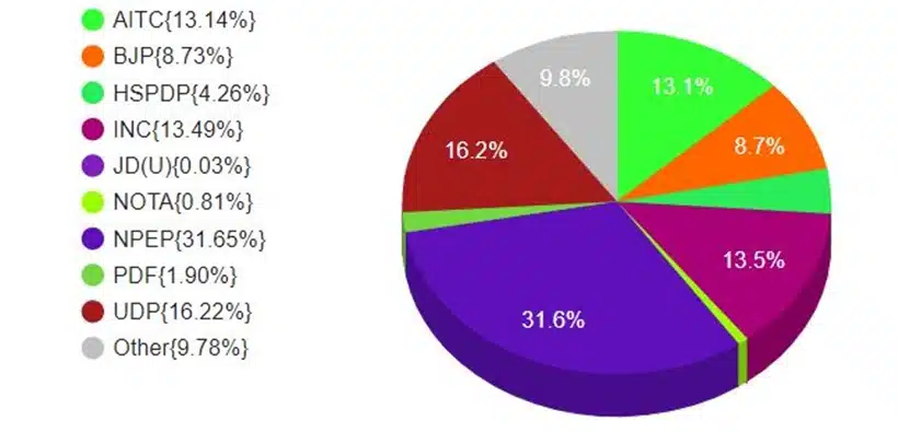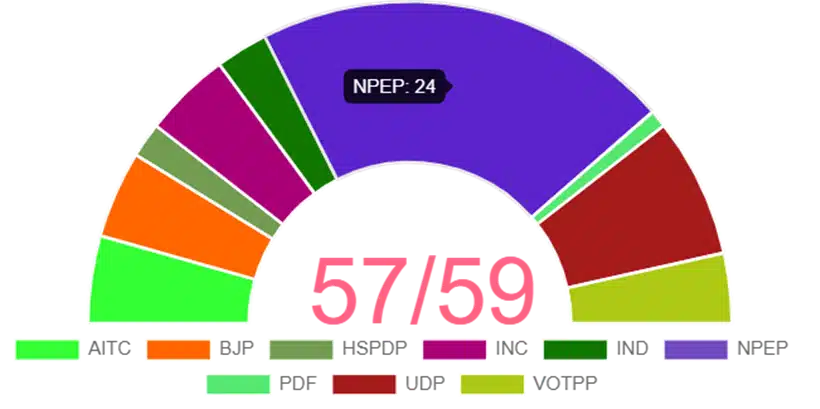 The Hill State People’s Democratic Party (HSPDP) was ahead in two seats, while two Independent candidates were also leading. People’s Democratic Front was leading in one seat, as per latest trends available for 55 out of 59 constituencies.
