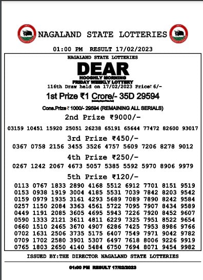 Nagaland State Dear Lottery Sambad Friday, February 17, 2023 Today 1 PM Winners Ticket Number List LIVE