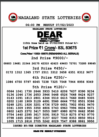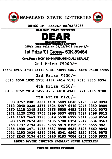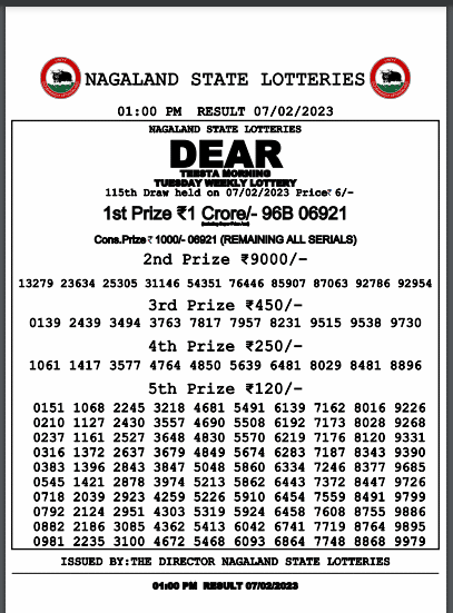 Nagaland State Dear Lottery Sambad Tuesday, February 7, 2023 Today 1 PM