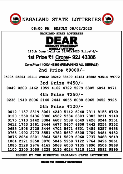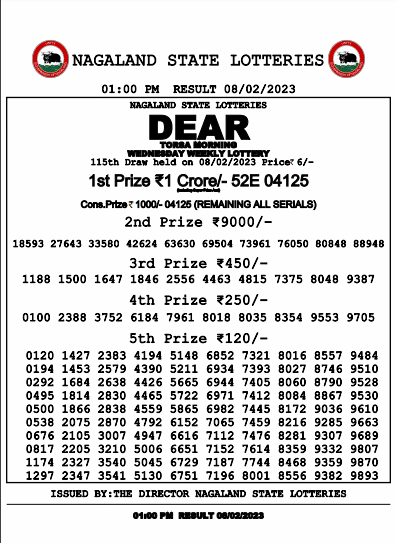 Nagaland State Dear Lottery Sambad Monday, February 6, 2023 Today 8 PM Winners Ticket Number List LIVE