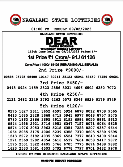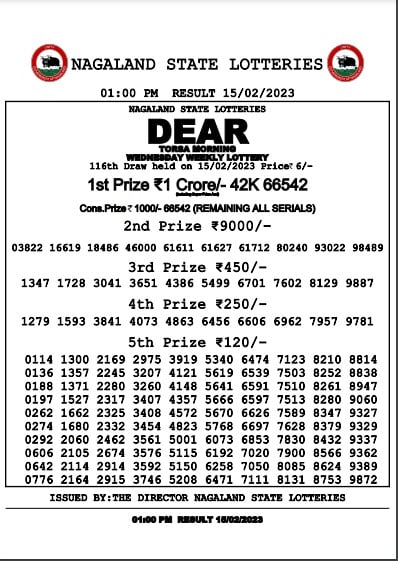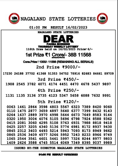 Nagaland State Dear Lottery Sambad Thursday, February 16, 2023 Today 1 PM, Winners Ticket Number List LIVE