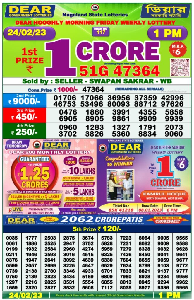 Nagaland State Dear Lottery Sambad Friday, February 24, 2023 Today 1 PM Winners Ticket Number List LIVE