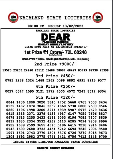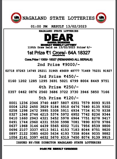 Nagaland State Dear Lottery Sambad Monday, February 13, 2023 Today 6 PM, Winners Ticket Number List LIVE