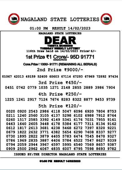 Nagaland State Dear Lottery Sambad Tuesday, February 14, 2023 Today 1 PM, 6 PM, 8 PM Winners Ticket Number List LIVE