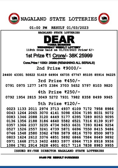 Nagaland State Dear Lottery Sambad Friday, March 03, 2023 Today 1 PM, Winners Ticket Number List LIVE