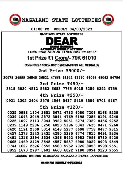 Nagaland State Dear Lottery Sambad Saturday, March 04, 2023 Today 1 PM, Winners Ticket Number List LIVE
