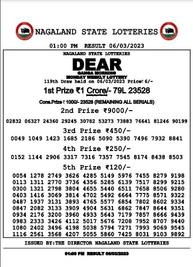 Nagaland State Dear Lottery Sambad Monday, March 06, 2023 Today 1 PM, Winners Ticket Number List LIVE
