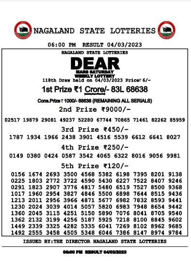 Table of Contents Nagaland State Dear Lottery Sambad Tuesday, March 14, 2023 Today 1 PM, 6 PM, 8 PM Winners Ticket Number List LIVE Introduction: How Does the Nagaland State Lottery Work? Types of Lotteries in Nagaland: Purchasing Lottery Tickets: Claiming Prizes: Nagaland state lottery results today Nagaland State Dear Lottery Sambad Tuesday, March 14, 2023 Today 8 PM Winners Ticket Number List LIVE Nagaland State Dear Lottery Sambad Tuesday, March 14, 2023 Today 6 PM Winners Ticket Number List LIVE Nagaland State Dear Lottery Sambad Tuesday, March 14, 2023 Today 1 PM, Winners Ticket Number List LIVE Nagaland State Dear Lottery Sambad Monday, March 13, 2023 Today 1 PM, Winners Ticket Number List LIVE Nagaland State Dear Lottery Sambad Tuesday, March 12, 2023 Today 8 PM Winners Ticket Number List LIVE Nagaland State Dear Lottery Sambad Tuesday, March 12, 2023 Today 6 PM, Winners Ticket Number List LIVE Nagaland State Dear Lottery Sambad Monday, March 06, 2023 Today 1 PM, Winners Ticket Number List LIVE Nagaland State Dear Lottery Sambad Saturday, March 04, 2023 Today 8 PM Winners Ticket Number List LIVE Nagaland State Dear Lottery Sambad Saturday, March 04, 2023 Today 1 PM, Winners Ticket Number List LIVE Nagaland State Dear Lottery Sambad Friday, March 03, 2023 Today 8 PM Winners Ticket Number List LIVE Nagaland State Dear Lottery Sambad Friday, March 03, 2023 Today 6 PM Winners Ticket Number List LIVE Nagaland State Dear Lottery Sambad Friday, March 03, 2023 Today 1 PM, Winners Ticket Number List LIVE Nagaland State Dear Lottery Sambad Thursday, March 02, 2023 Today 1 PM Winners Ticket Number List LIVE Nagaland State Dear Lottery Sambad Wednesday, March 01, 2023 Today 8 PM Winners Ticket Number List LIVE Nagaland State Dear Lottery Sambad Wednesday, March 01, 2023 Today 6 PM, Winners Ticket Number List LIVE Nagaland State Dear Lottery Sambad Wednesday, March 01, 2023 Today 1 PM, Winners Ticket Number List LIVE Nagaland State Dear Lottery Sambad Monday, February 27, 2023 Today 8 PM Winners Ticket Number List LIVE Nagaland State Dear Lottery Sambad Monday, February 27, 2023 Today 6 PM, Winners Ticket Number List LIVE Nagaland State Dear Lottery Sambad Monday, February 27, 2023 Today 1 PM, Winners Ticket Number List LIVE Nagaland State Dear Lottery Sambad Thursday, February 23, 2023 Today 1 PM, Winners Ticket Number List LIVE Nagaland State Dear Lottery Sambad Monday, February 20, 2023 Today 1 PM, Winners Ticket Number List LIVE Nagaland State Dear Lottery Sambad Friday, February 17, 2023 Today 1 PM Winners Ticket Number List LIVE Nagaland State Dear Lottery Sambad Thursday, February 16, 2023 Today 1 PM, Winners Ticket Number List LIVE Nagaland State Dear Lottery Sambad Wednesday, February 15, 2023 Today 1 PM, Winners Ticket Number List LIVE Nagaland State Dear Lottery Sambad Tuesday, February 14, 2023 Today 1 PM, 6 PM, 8 PM Winners Ticket Number List LIVE Nagaland State Dear Lottery Sambad Monday, February 13, 2023 Today 8 PM Winners Ticket Number List LIVE Nagaland State Dear Lottery Sambad Monday, February 13, 2023 Today 6 PM, Winners Ticket Number List LIVE Nagaland State Dear Lottery Sambad Monday, February 13, 2023 Today 1 PM, Winners Ticket Number List LIVE Nagaland State Dear Lottery Sambad Wednesday, February 9, 2023 Today 1 PM, Winners Ticket Number List LIVE Nagaland State Dear Lottery Sambad Wednesday, February 8, 2023 Today 8 PM Winners Ticket Number List LIVE Nagaland State Dear Lottery Sambad Wednesday, February 8, 2023 Today 6 PM, Winners Ticket Number List LIVE Nagaland State Dear Lottery Sambad Wednesday, February 8, 2023 Today 1 PM, Winners Ticket Number List LIVE Nagaland State Dear Lottery Sambad Tuesday, February 7, 2023 Today 8 PM, Winners Ticket Number List LIVE Nagaland State Dear Lottery Sambad Tuesday, February 7, 2023 Today 6 PM, Winners Ticket Number List LIVE Nagaland State Dear Lottery Sambad Tuesday, February 7, 2023 Today 1 PM Nagaland State Dear Lottery Sambad Monday, February 6, 2023 Today 8 PM Winners Ticket Number List LIVE Nagaland State Dear Lottery Sambad Monday, February 6, 2023 Today 6 PM Winners Ticket Number List LIVE Nagaland State Dear Lottery Sambad Monday, February 6, 2023 Today 1 PM, 6 PM, 8 PM Winners Ticket Number List LIVE Nagaland State Dear Lottery Sambad Friday, February 24, 2023 Today 1 PM Winners Ticket Number List LIVE Nagaland State Dear Lottery Sambad Friday, February 4, 2023 Today 8 PM Winners Ticket Number List LIVE Nagaland State Dear Lottery Sambad Friday, February 24, 2023 Today 6 PM Winners Ticket Number List LIVE Nagaland State Lottery Sambad Result Today 04.2.2023 Live Draw