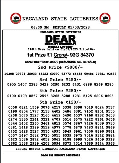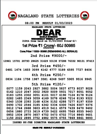 Nagaland State Dear Lottery Sambad Wednesday, March 01, 2023 Today 6 PM, Winners Ticket Number List LIVE